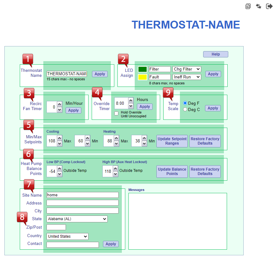 Thermostat Name: Enter a descriptive name for the thermostat. This can be any name up to 15 characters. Use A-Z, a-z, 0-9 and !@#$%^&*()/|-_ symbols. No spaces are allowed. This name will show up in the upper right-hand corner of each thermostat page. Click APPLY after making changes. |